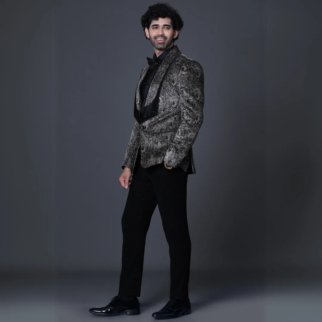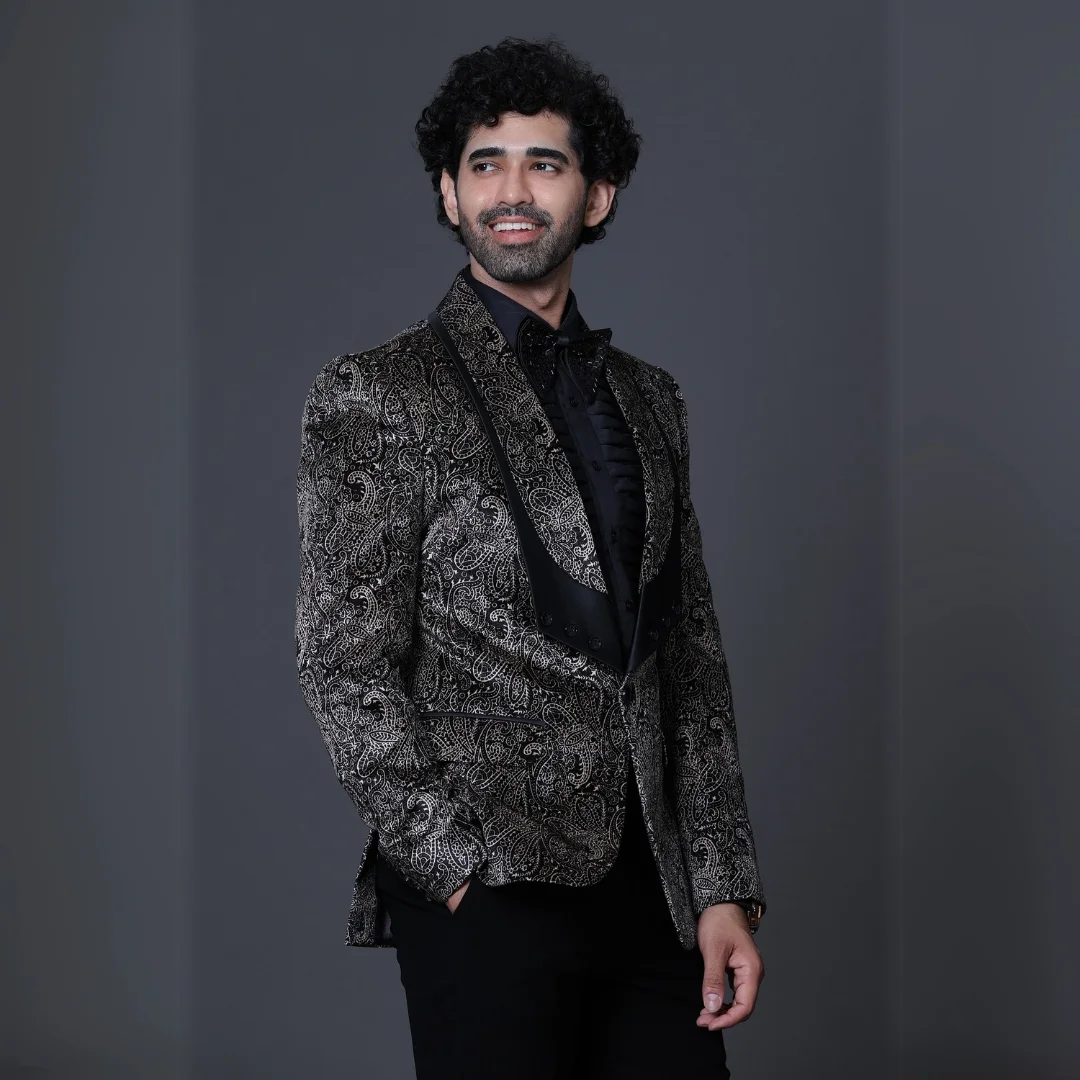 Design : The black and whait embroidery (craftsmanship ) creates an elegant and intricate pattern, elevating the blazer for a refined and timeless look.