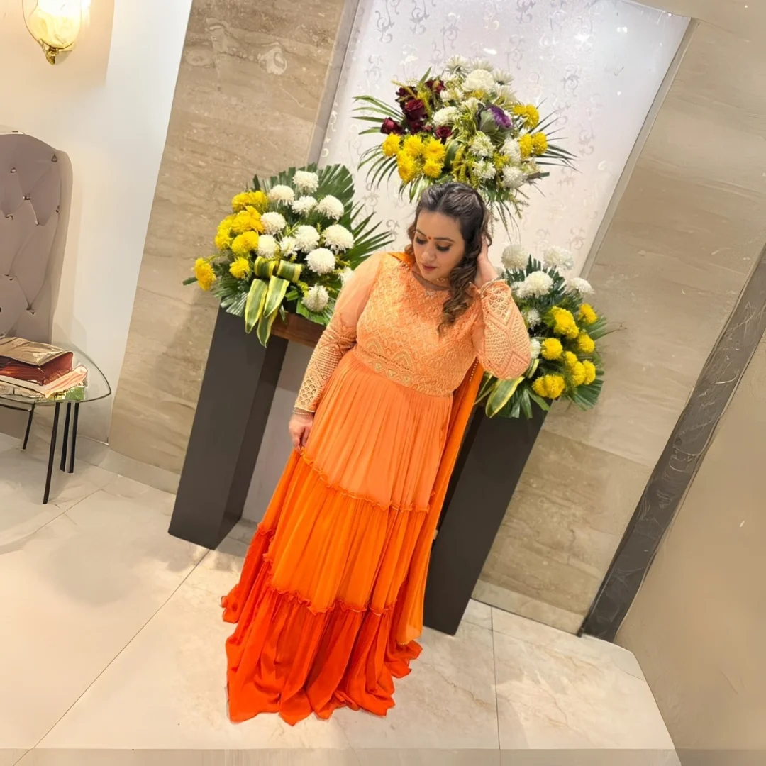 This stunning ombre Anarkali gown features an intricately embroidered bodice, sheer net sleeves, and a tiered flowy skirt in vibrant shades of orange. The elegant silhouette and rich detailing make it perfect for festive occasions and celebrations.