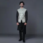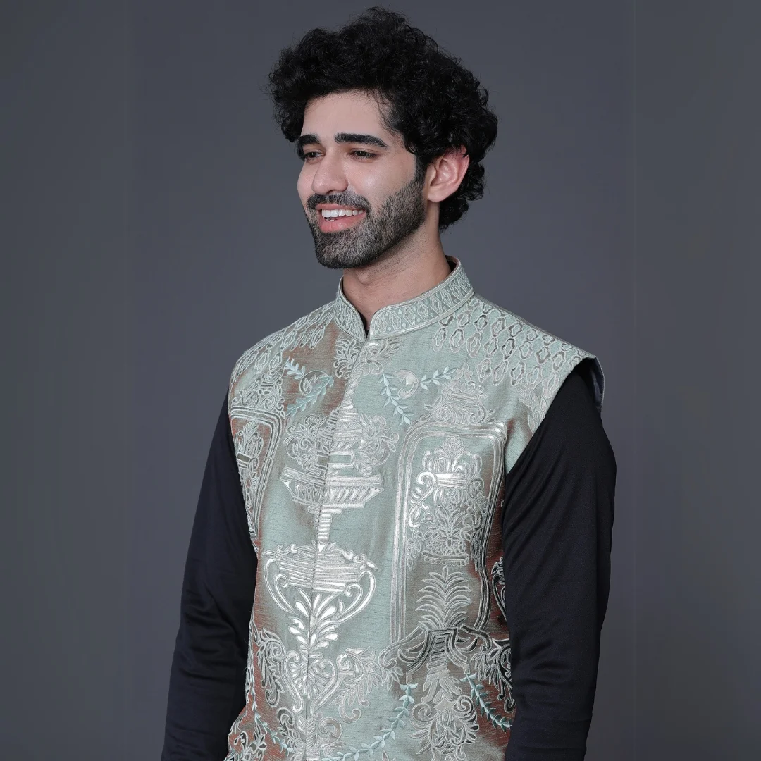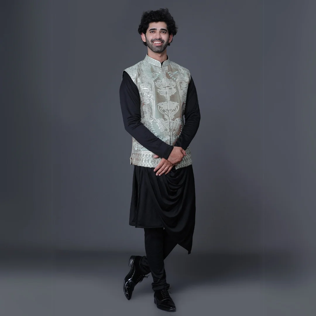 Package contains : Kurta/ Pajama/ Koti Work Detail: Leather Work Fabric: Raw Silk Dispatch Timeline: 5 to 6 Weeks Wash Care: Dry Clean Only.