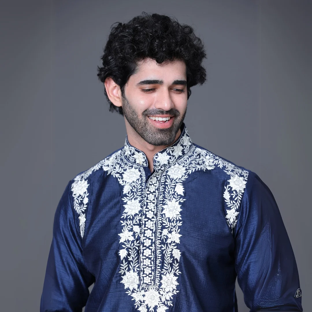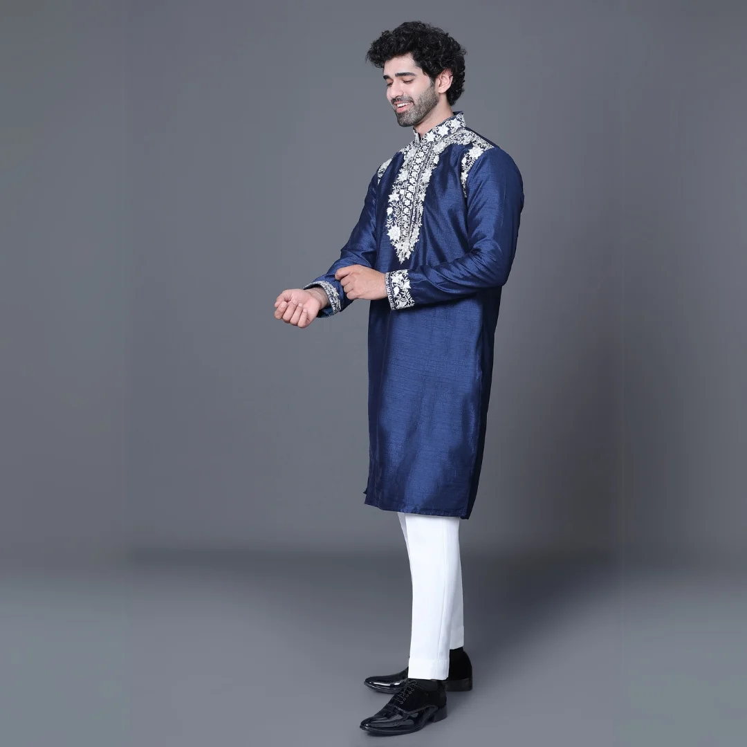 Color of Kurta: Blue (Thread work detail, Floral woven design, Mandarin collar)