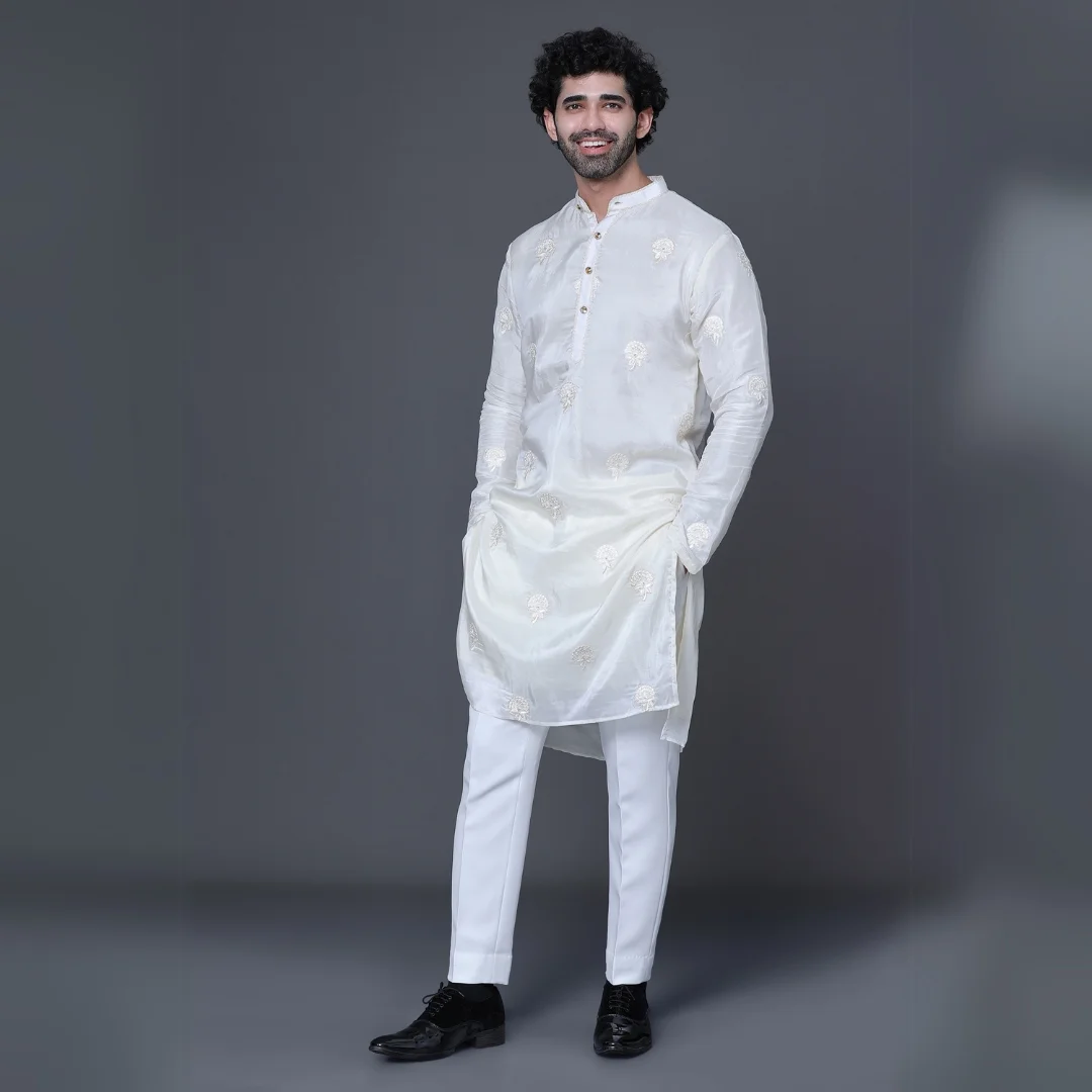 White thread embroidery kurta set