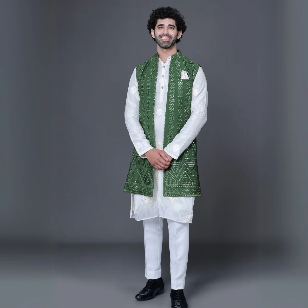 White Kurta With long Green Jacket