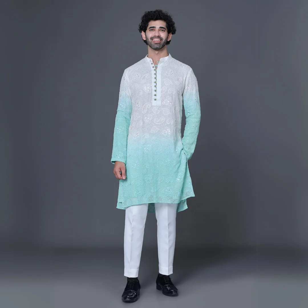 Pista green leather embroidery kurta set