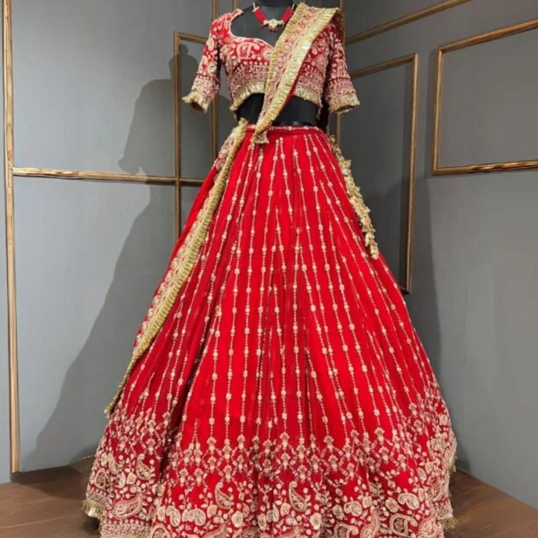 Red pearl work Embrodiary lehenga